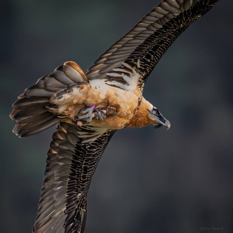 Gypaète barbu nom : Aven, jeune femelle née le 9 mars 2020 au centre d'élevage des Green Balkans, en Bulgarie. Lâchée le 31/07/2020 sur le site de Frépestel (Meyrueis, Lozère) 🌱