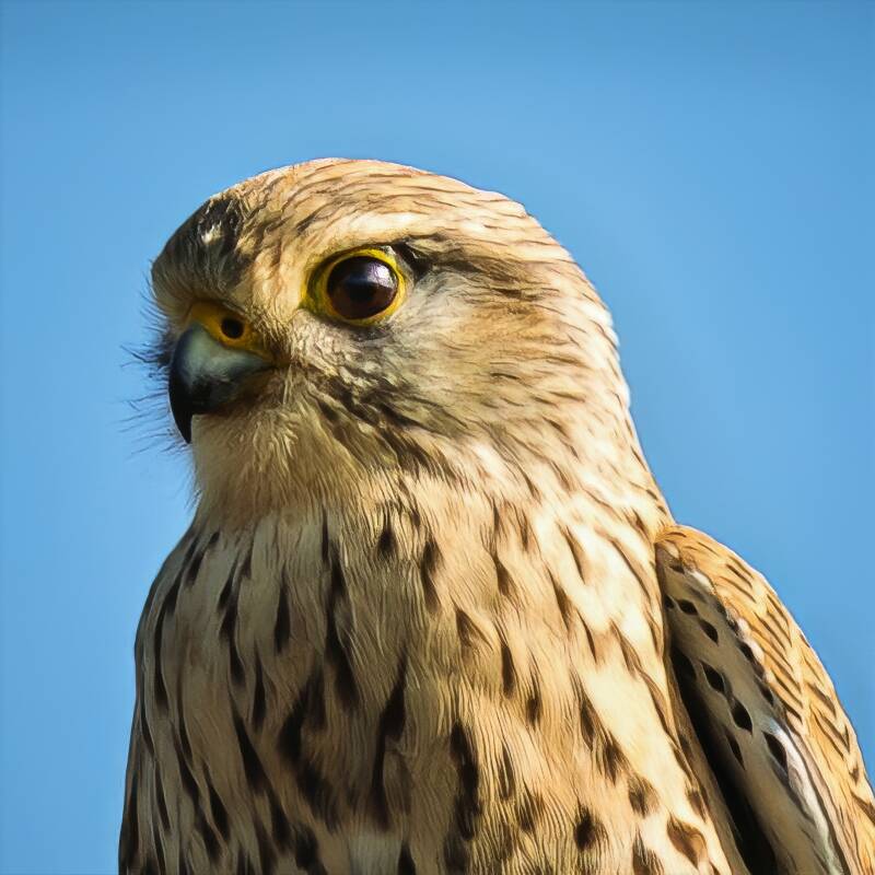 Les yeux du Faucon crécerelle sont donc des organes très performants. Rappelons qu'il est capable de voir un insecte de 2 mm à 18 mètres de distance ! De plus, les taches sombres qu'il a sous les yeux absorbent les rayons du soleil et l'empêchent d'être ébloui.